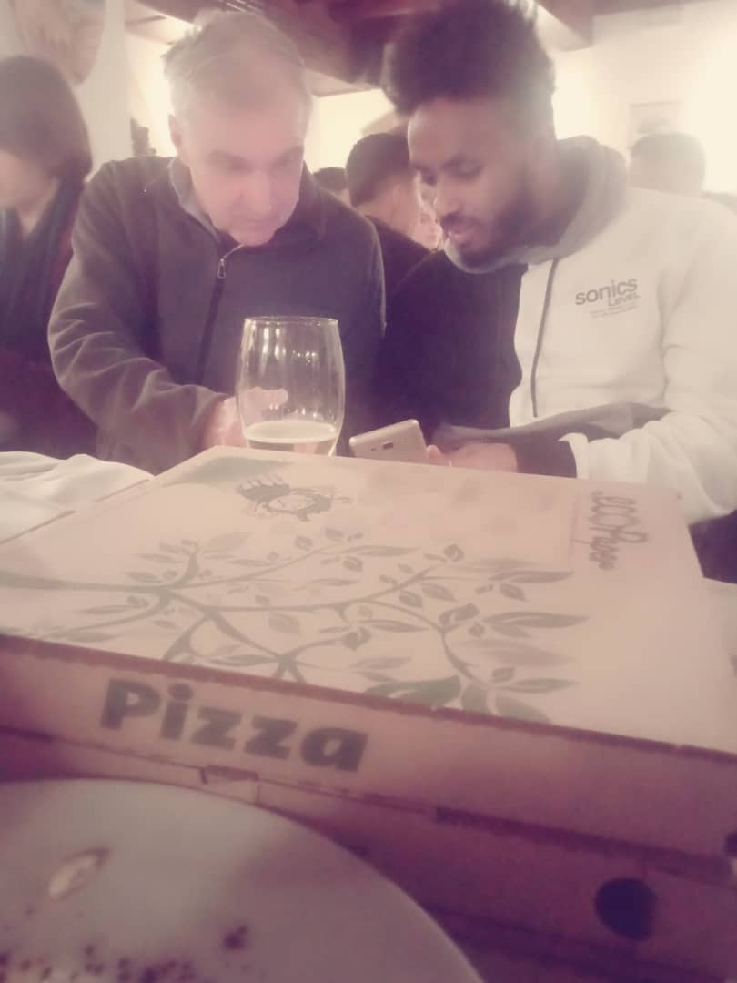 La serata si è conclusa in pizzeria tra complicità, fame e battute insieme a qualche parola in italiano, dire pizza è facile . Temesegen Solyana e Thomas erano sbalorditi di tanta vita e di tanta possibile normalità. La prima cena fuori dopo la fuga dall’ Etiopia . La pace comincia da qui!